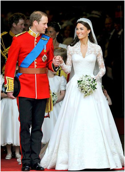 Christian Lacroix: “I like the dress very much, simpler than expected. A combination just in between the 1956 Grace Kelly and 1947 Queen Elizabeth dress[es]. I love the modest veil with the Queen Mother’s 30s scroll tiara and balanced volume of the whole gown. She’s radiant; she never was so beautiful. And Prince William’s red Irish uniform is gorgeous.”